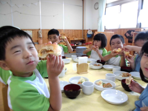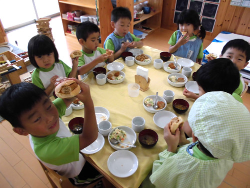バンズパンにはさんで、ハンバーガーにしている子ども達が