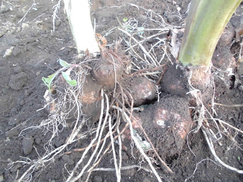 里芋は葉がずいぶん大きく成長していたので今日掘り起こしました。
