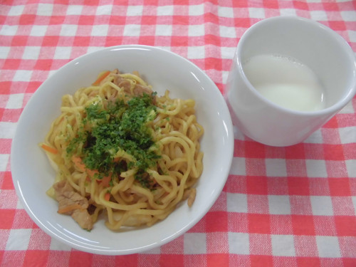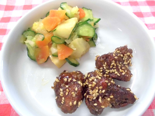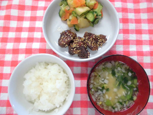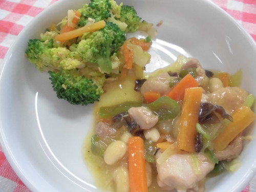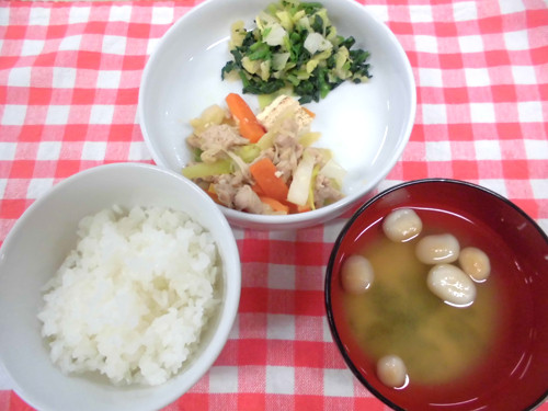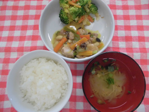 今日の給食(夏見台幼稚園・保育園)2014.3.25 鶏肉と大豆のみそ炒め