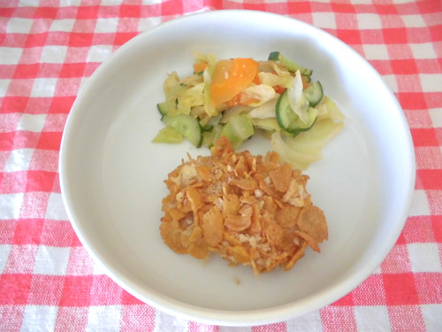 今日の給食(夏見台幼稚園・保育園)2014.3.31 鶏のフレーク焼き