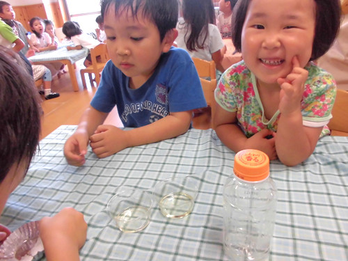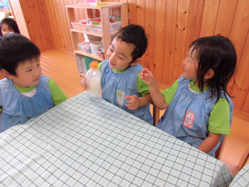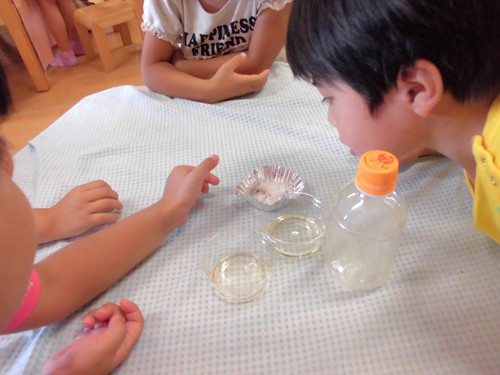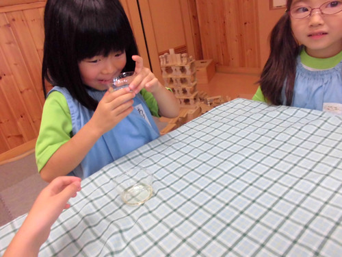 塩と砂糖、酢と油をそれぞれ見比べ、においをかいで確認しました。