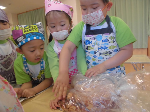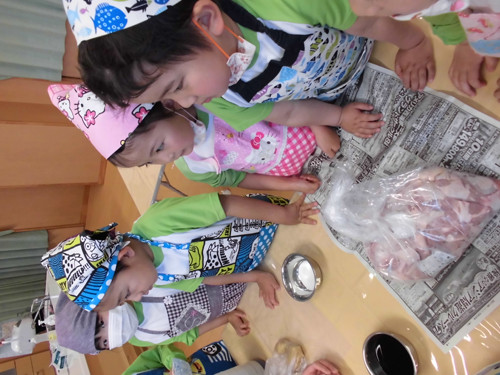 からあげは調味料を加えてみんなでモミモミ!