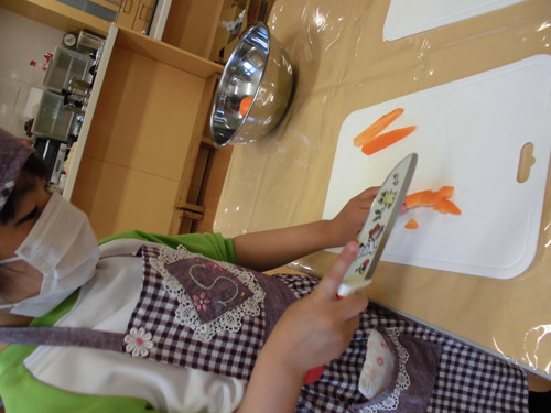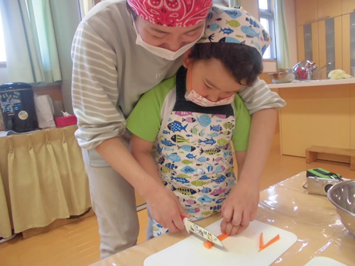 包丁を使って人参・じゃがいもをサイコロ状に切る作業も頑張りました!