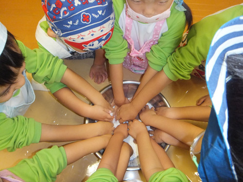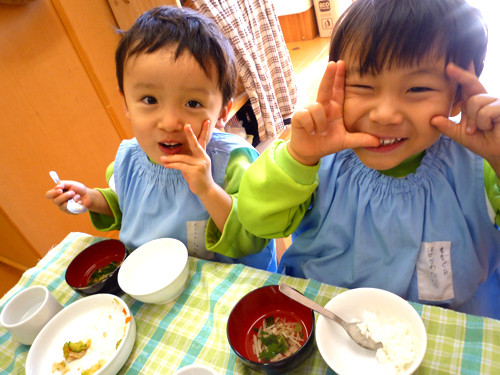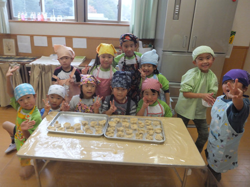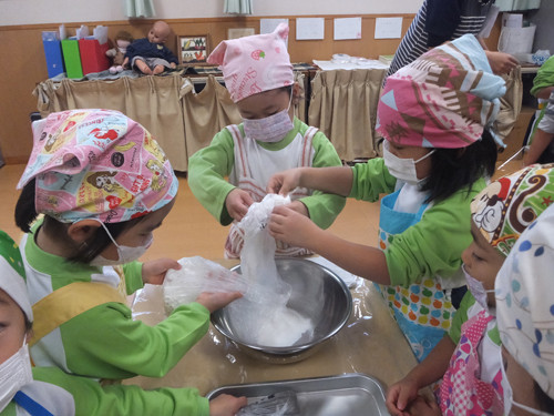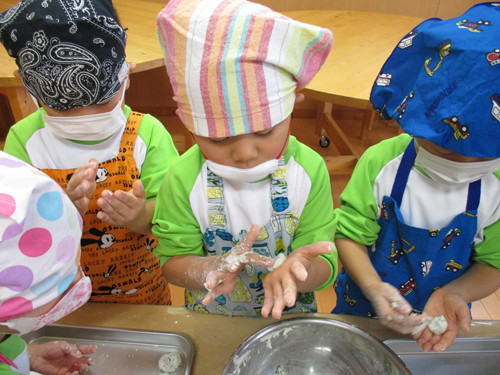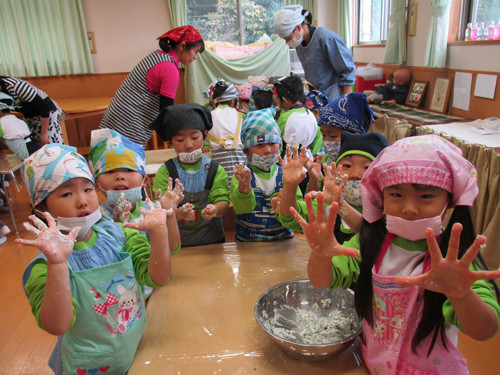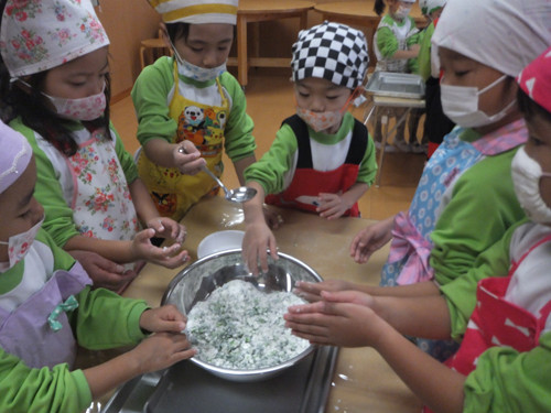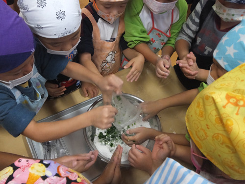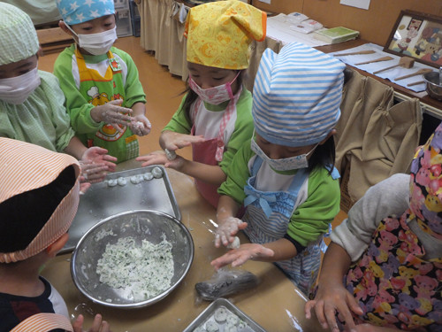 今日から3日間、年中さんが小松菜団子作りを行います。