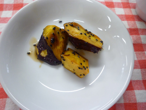 バターと生クリームと砂糖を一緒に混ぜて栗のように三角に形作っています。下に白ごまをつけてオーブンで軽く焼いて、スイートポテトのような味になっています!