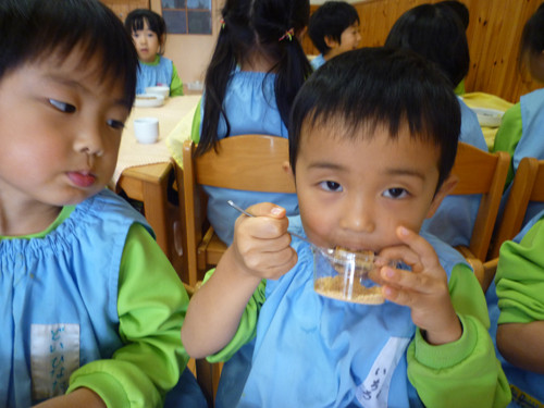 スープに卵を流し込んだ瞬間に卵の形が変わることに子ども達はびっくりしていました(^^)