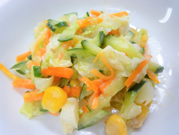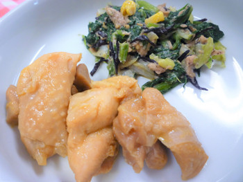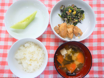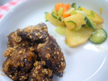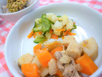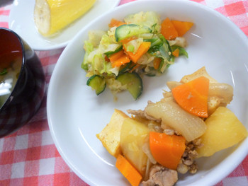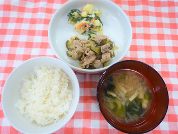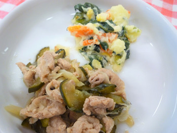 今日の給食(夏見台幼稚園・保育園)2018.6.29 豚肉ときゅうりの炒め物