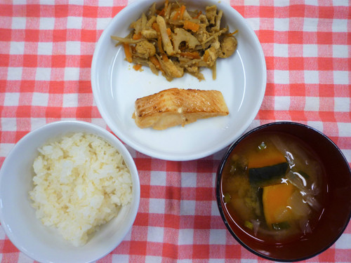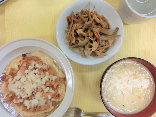 照り焼きチキンピザ・コーンスープ・金平ごぼう・バナナです。
