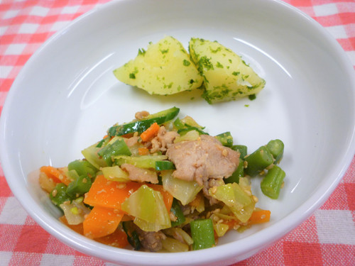 照り焼きチキンや金平、コーンスープもみんなで順番に炒めて煮込んで、IHもフル活用!