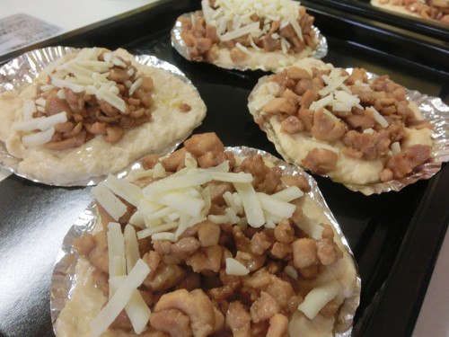 ピザ作りは、粉を混ぜてしっかり揉みこみ生地を作り、チキンとチーズをのせてオーブンへ!