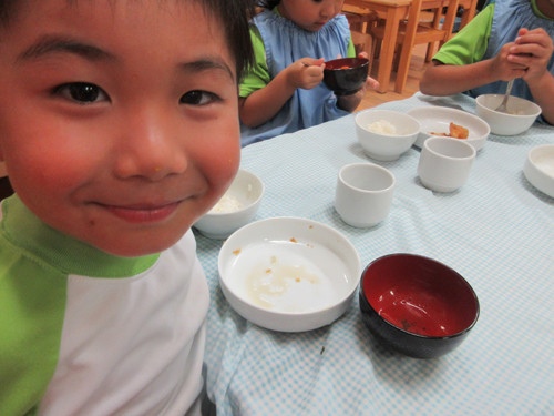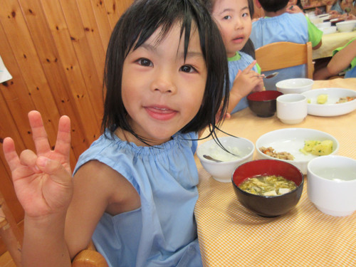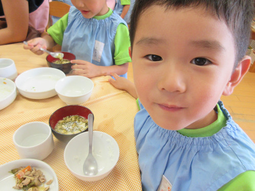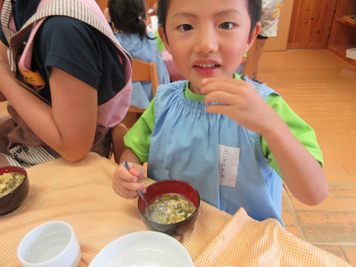 今日は、スープの中に冬瓜を入れました。夏に収穫され、冬まで保存できるため「冬瓜」という名前がついたといわれています。「とろとろしてる〜」「おいし〜!」といい反応のこども達でした♪今日のように、和風の味付けだけじゃなく、コンソメスープなどでも合うのでお家でもぜひいれてみてください。