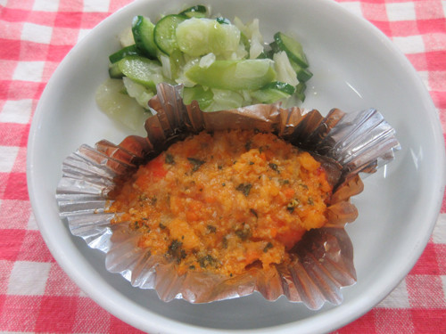 スパゲッティなどの麺類は、ごはんに比べて咀嚼回数が少なくなります。なので、今日は、スティック野菜にしてバリバリと沢山噛んでもらえる副菜にしました♪
