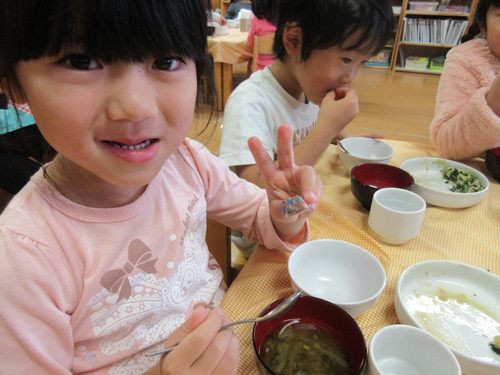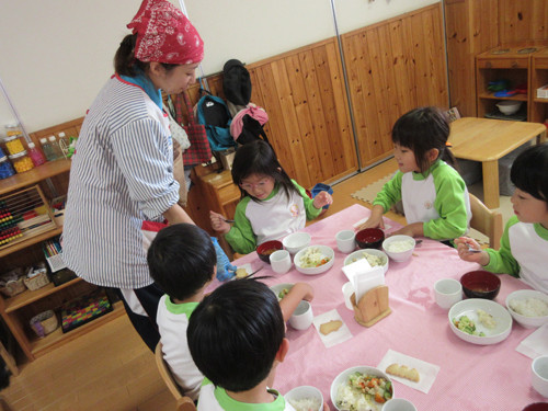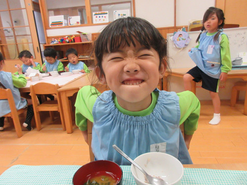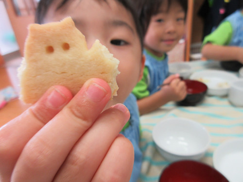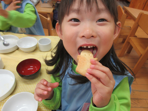 今日は特別に、クッキーをだしました‼ひとクラスでまとめて中身が見えないように紙袋にラッピングしたので、どんな形のクッキーが入っているか分からなくてワクワクどきどきのこども達・・・!3種類あるクッキーに気持ちがいいくらい大興奮してくれたこども達でした♪Aコースの子たちは、園の手作りクッキーを食べることがないので(おやつを食べないので)いい機会となりました。
