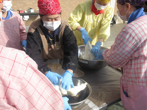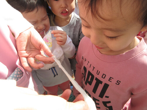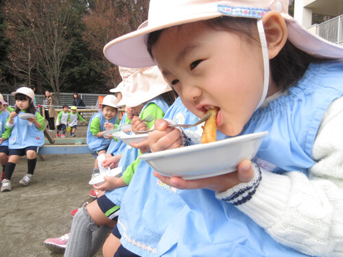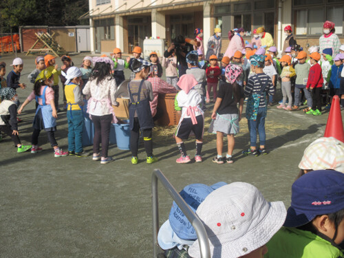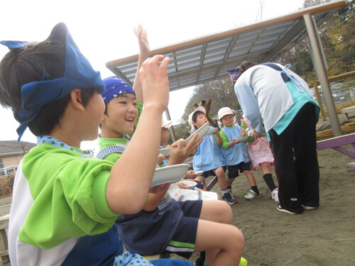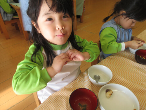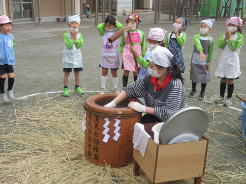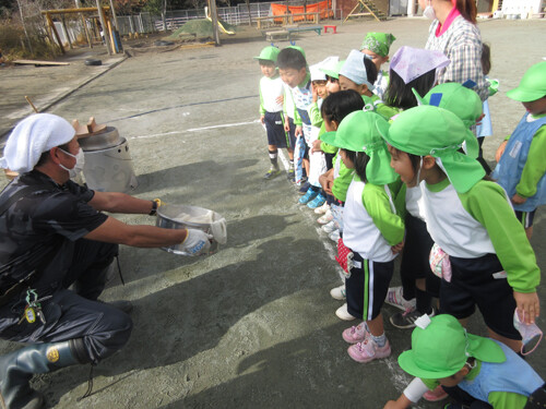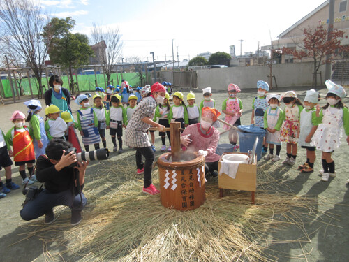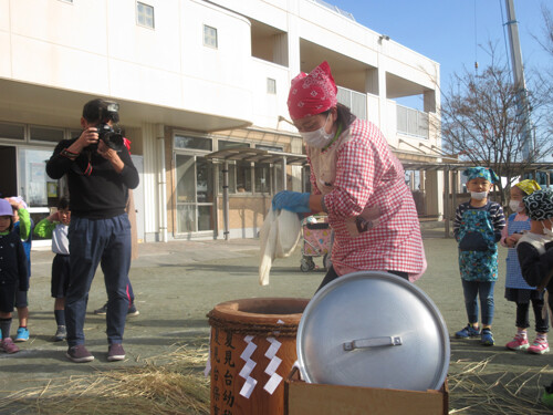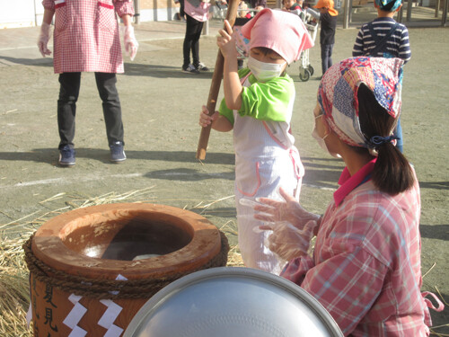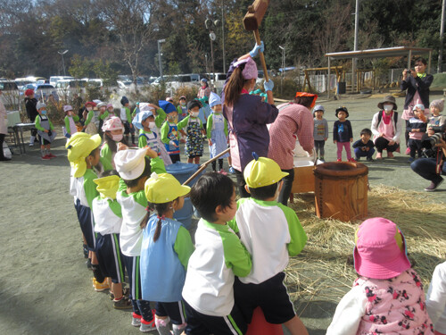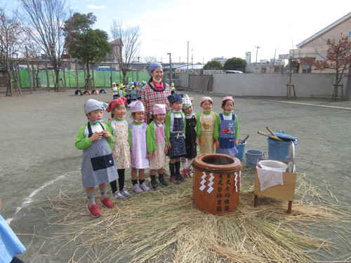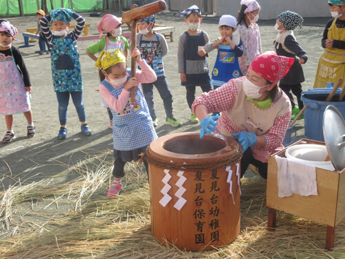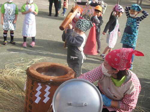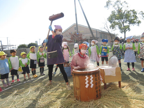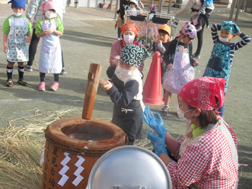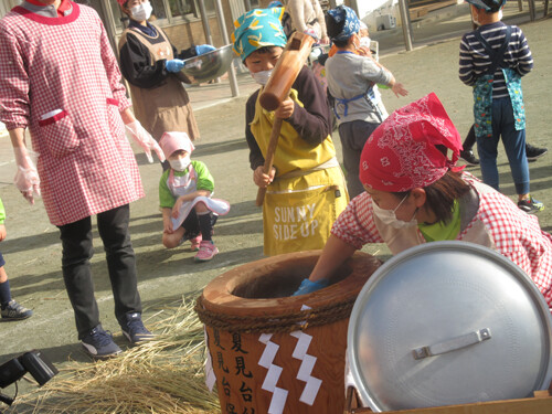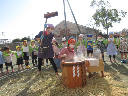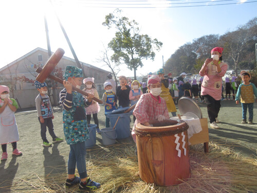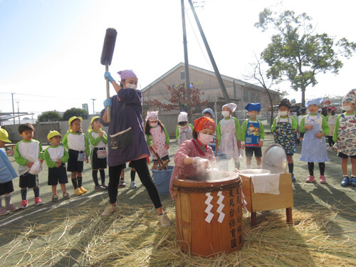 今日は園庭にて、餅つきを行いました。朝、霧がかかっておりましたが、もちをつきはじめてから太陽がかおをだしぽかぽかと暖かい気候のもとおこなうことができました。年長さんが代表してクラスのおもちを力強くぺったんぺったん、年少中さんは周りをかこんで応援しながらエアーでぺったんぺったんとついていました。できたてほやほやのおもちは、まっしろでふわふわ。とってもとっても美味しいおもちに大満足でした♪