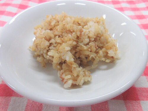 バター醤油おかかおにぎり(NEW)炒ったかつお節、しらすを入れてバターとしょうゆで味付けました。かつお節は、消化しやすいたんぱく質で他にも嬉しい栄養素が沢山なので積極的にとりいれたい食材のひとつです。バターでエネルギーを上げ、しらすでカルシウムをプラスしたおやつです♪