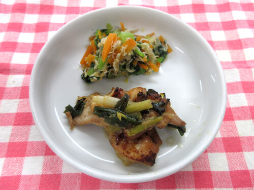 にんにく、みりん、しょうゆ、塩で味付けをしたお肉を炒め、