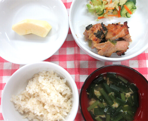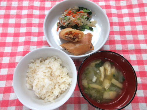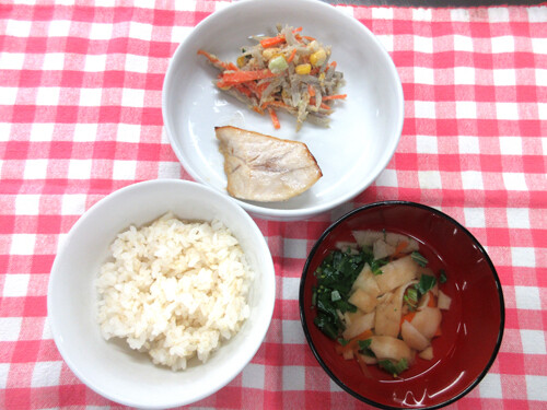みそ汁(じゃが芋・玉ねぎ・小松菜)※かぼちゃのみそ汁→じゃが芋のみそ汁に献立変更させていただきました。