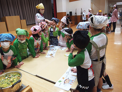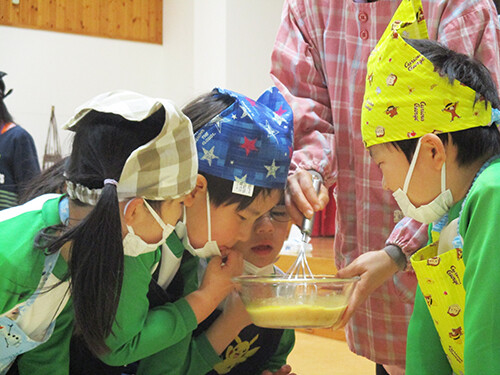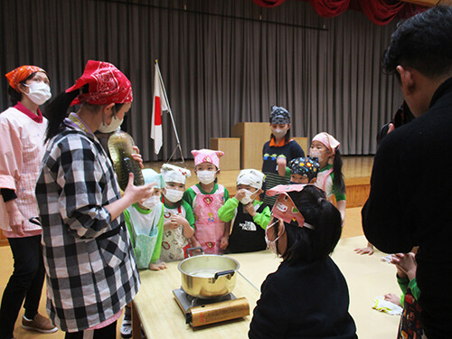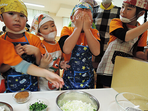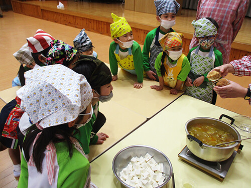 出来上がった豚汁を前に「やった〜!!」「早く食べたーい!!」と興奮いっぱいの年長さん。