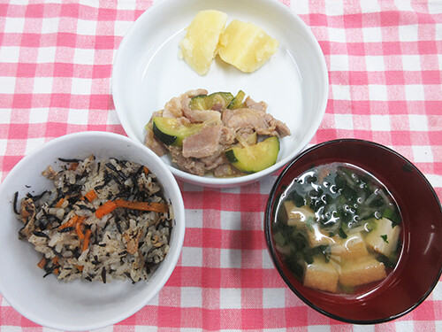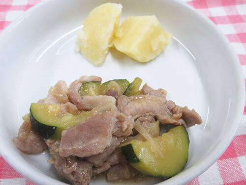 今日の給食(夏見台幼稚園・保育園)2025.7.25 ズッキーニと豚肉の炒め物