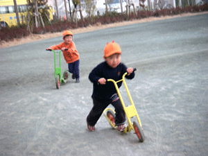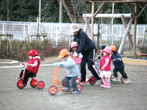 夕方、園庭をのぞいてみたら、保育園の子どもたちがとっても楽しそうに遊んでいました。園庭にラインを引き、その上をスクーターで走る・・・まるで電車のようでした。