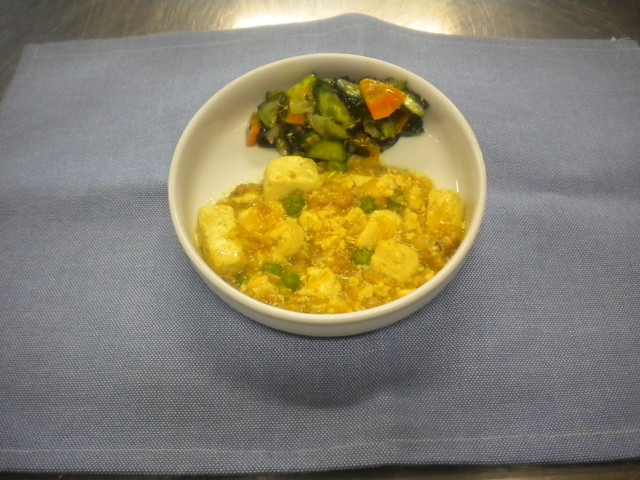 ごはん じゃが芋のスープ 麻婆豆腐 わかめのごまドレッシングあえ 果物 でした。