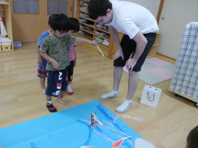 アクティビティとして魚釣りを私が提案、アンソニー先生にその方法を