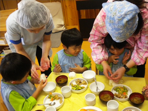 慣れた手つきで上手に三角おにぎりを作って見せてくれる子がいました。