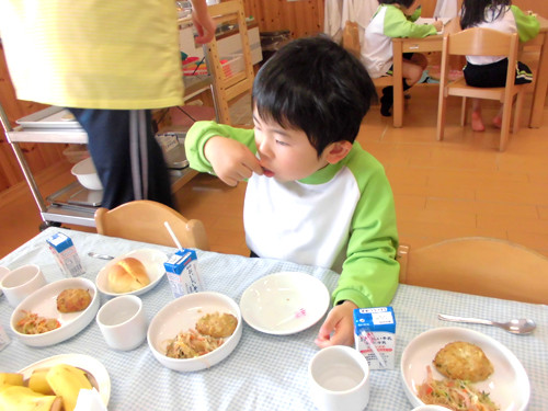 朝、給食室に「今日のごはんなに〜?」と聞きに来た子たちに