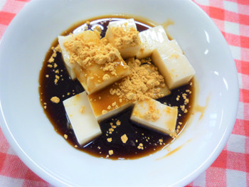 園ではミカン缶を使わないので、きなこ黒蜜味の牛乳寒天を提供しています。