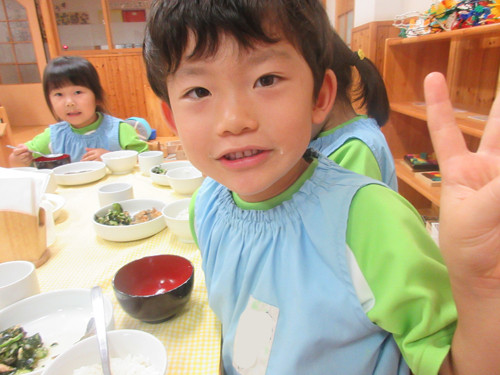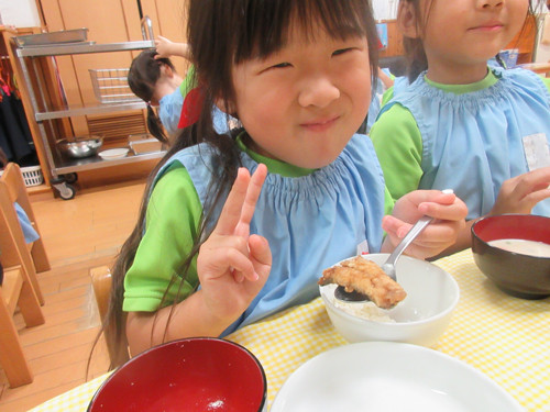 水煮大豆をすりつぶしたものを具沢山のみそ汁にいれたものが一般的な呉汁ですが、園では水煮大豆ではなく豆乳を入れています。