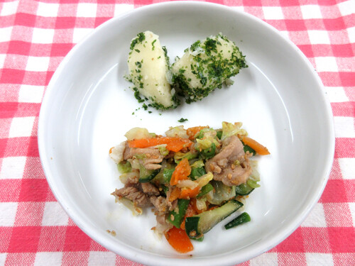 下味をつけた豚肉と別で茹でた野菜を手作りドレッシングで和えます。
