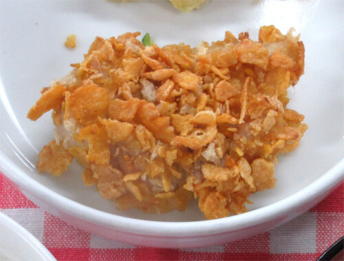 表面にあるカリカリのコーンフレークと肉汁溢れるやわらかいお肉のダブル食感が美味しさをひきたたせてくれます。