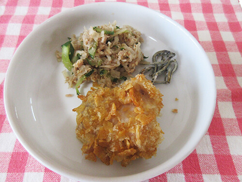 粉々にした無糖のコーンフレークとパン粉をまぶしてオーブンで焼きます。